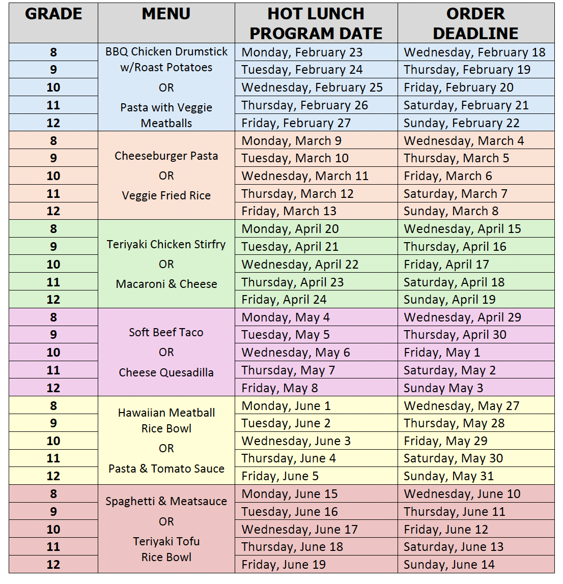 The Universal Hot Lunch Pilot will continue at Richmond Secondary School through to the remainder of the school year. RHS students will be offered a hot lunch at no cost in February, March, April, May, and twice in June following the schedule below: