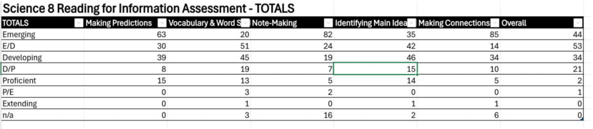 With a literacy focus on supporting students in their initial comprehension, specifically students' ability to follow instructions and understand text, our Science 8 teachers and all the grade 8 science students were involved in a science-based literacy assessment looking at students' proficiency with the following skills:
